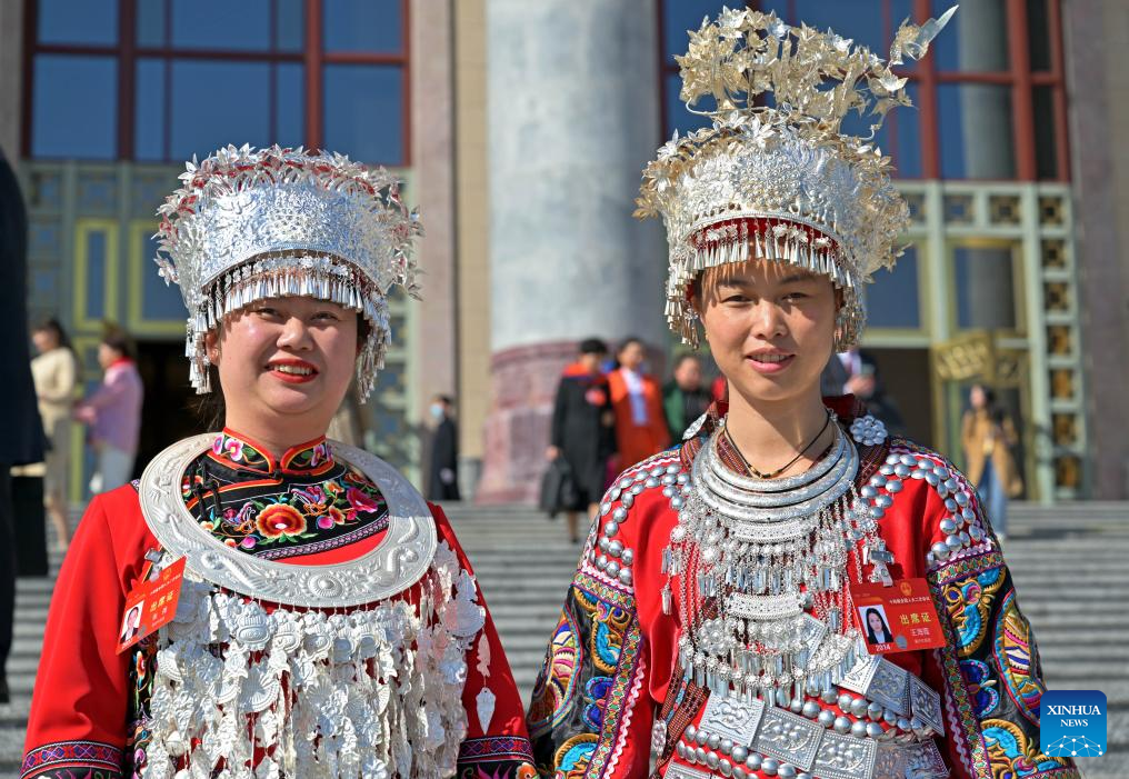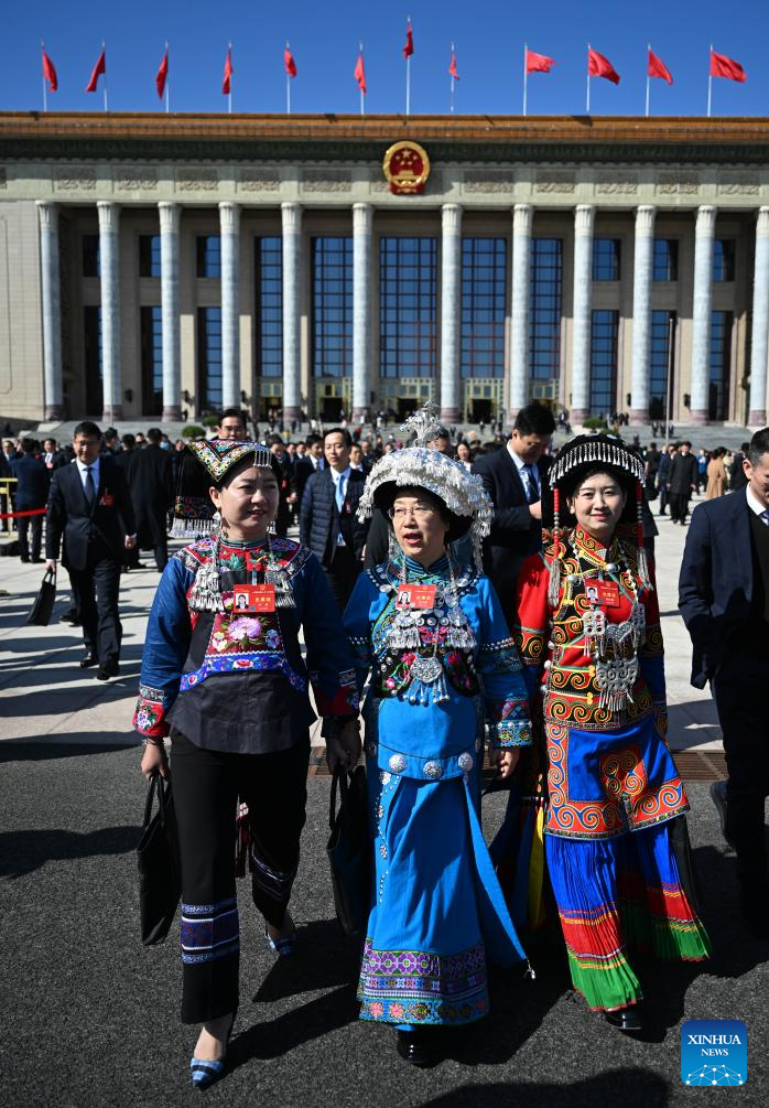 Deputies to the 14th National People's Congress (NPC) Lu Dan (L), Zhao Ziyi(C) and Fu Qingmei walk out of the Great Hall of the People after attending the second plenary meeting of the second session of the 14th NPC in Beijing, capital of China, March 8, 2024. (Xinhua/Li Ga)