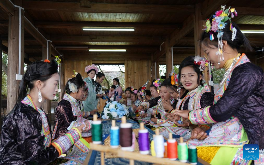 Women of the Miao ethnic group attend an embroidery game in Basha Village of Congjiang County, southwest China's Guizhou Province, March 8, 2024. Various activities were held across the country to celebrate International Women's Day. (Photo by Lu Zhongnan/Xinhua)