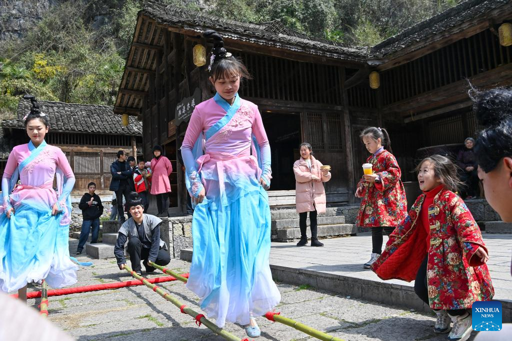 Visitors have fun at a scenic spot in Youyang Tujia and Miao Autonomous County, southwest China's Chongqing Municipality, March 8, 2024. Various activities were held across the country to celebrate International Women's Day. (Photo by Qiu Hongbin/Xinhua)
