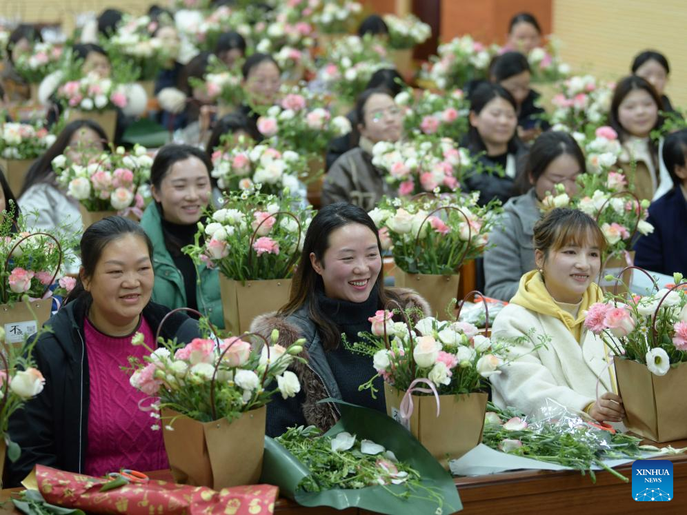 Staff members make flower arrangements in Bijie City of southwest China's Guizhou Province, March 8, 2024. Various activities were held across the country to celebrate International Women's Day. (Photo by Yang Pinyi/Xinhua)