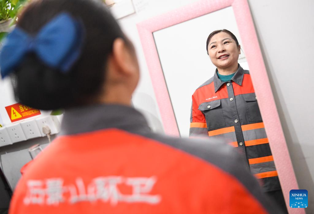 Liu Mingqun checks her appearance in front of a mirror at a garbage station in a residential area of Shijingshan District in Beijing, capital of China, Feb. 27, 2024. (Xinhua/Chen Zhonghao)