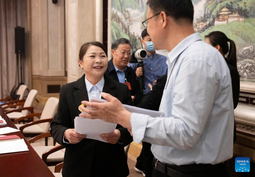 Liu Mingqun (1st L) communicates with a staff member during a group meeting of Beijing delegation at the second session of the 14th National People's Congress (NPC) in Beijing, capital of China, March 6, 2024. (Xinhua/Cai Yang)