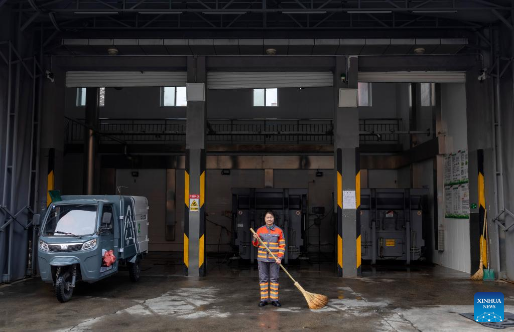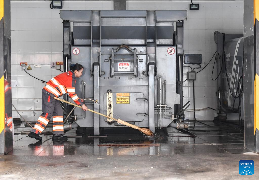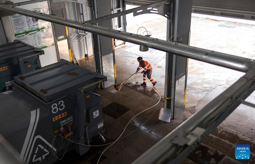 Liu Mingqun works at the garbage station in a residential area of Shijingshan District in Beijing, capital of China, Feb. 27, 2024. (Xinhua/Cai Yang)