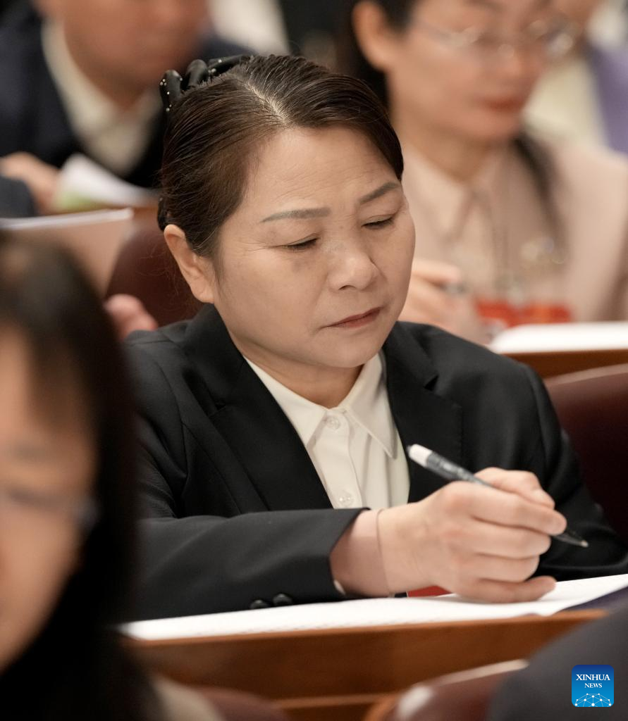 Liu Mingqun (2nd R) speaks during a group meeting of Beijing delegation at the second session of the 14th National People's Congress (NPC) in Beijing, capital of China, March 6, 2024. (Xinhua/Cai Yang)