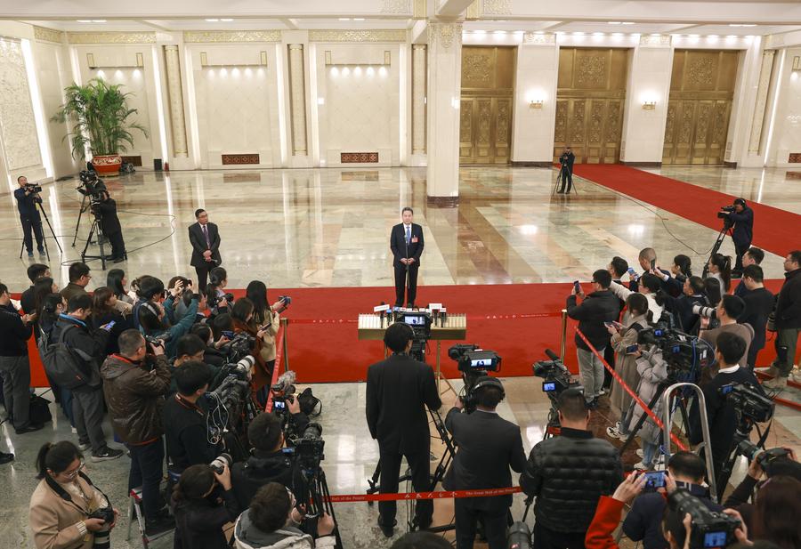 Chinese Minister of Transport Li Xiaopeng gives an interview after the second plenary meeting of the second session of the 14th National People's Congress (NPC) at the Great Hall of the People in Beijing, capital of China, March 8, 2024. (Xinhua/Wang Jingqiang)