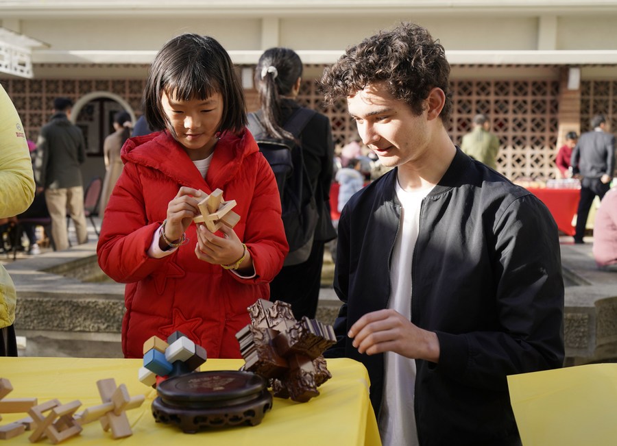 People try burr puzzles, an art form of intangible cultural heritage, at a tourism promotional event in San Francisco, California, the United States, on March 7, 2024. (Photo by Li Jianguo/Xinhua)