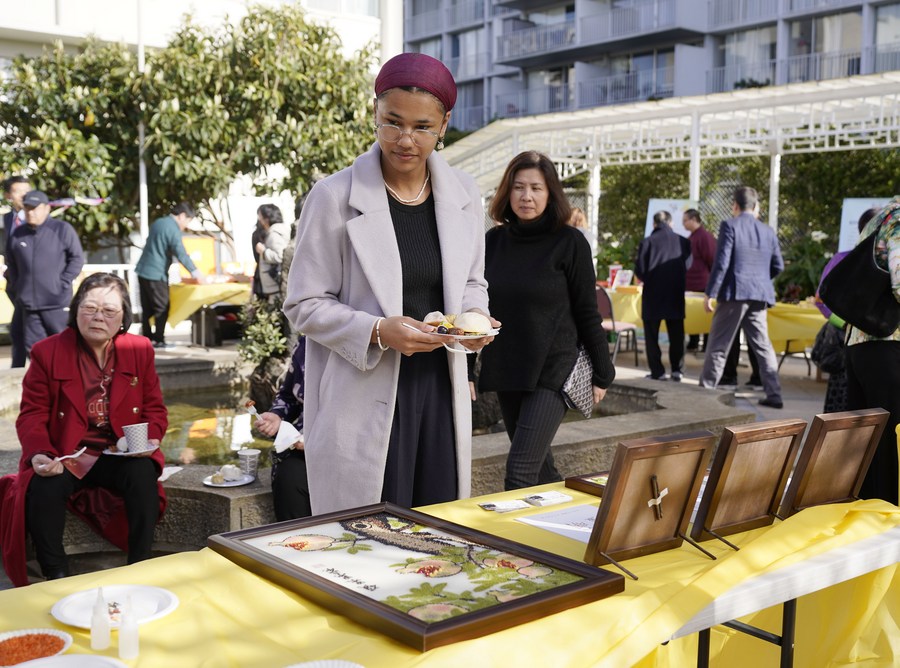 A visitor views grain painting, an art form of intangible cultural heritage, at a tourism promotional event in San Francisco, California, the United States, on March 7, 2024. (Photo by Li Jianguo/Xinhua)
