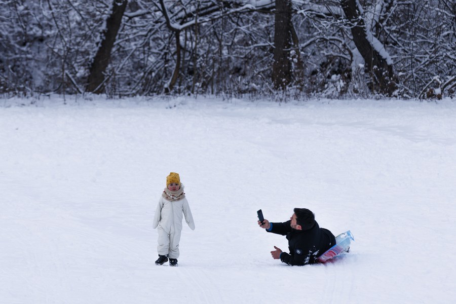 A man takes photos for a child in the snow in Washington, D.C., the United States, Jan. 19, 2024. (Photo by Aaron Schwartz/Xinhua)