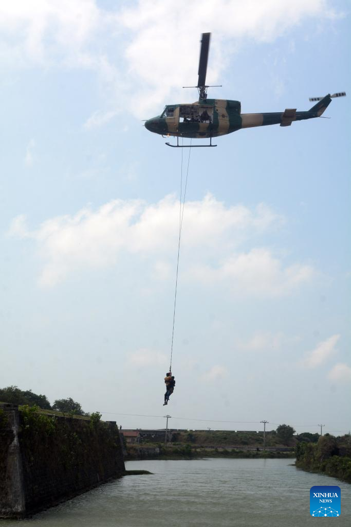 A rescue exercise is displayed during the "Air Tattoo - 2024" technological and educational exhibition in Jaffna, Sri Lanka, on March 9, 2024. The exhibition is scheduled to run from March 6 to 10, in commemoration of the 73rd anniversary of the Sri Lanka Air Force. (Photo by Gayan Sameera/Xinhua)