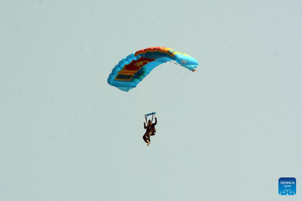 A paratrooper takes part in the "Air Tattoo - 2024" technological and educational exhibition in Jaffna, Sri Lanka, on March 9, 2024. The exhibition is scheduled to run from March 6 to 10, in commemoration of the 73rd anniversary of the Sri Lanka Air Force. (Photo by Gayan Sameera/Xinhua)