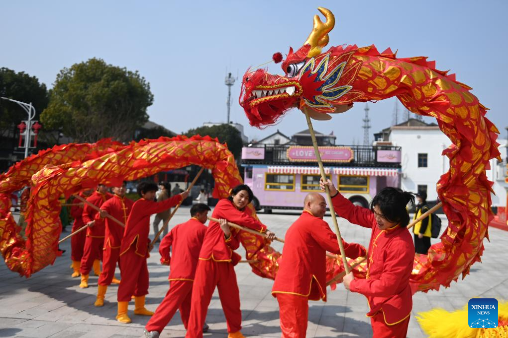 Folk artists perform dragon dance during a parade at Shuanglin ancient town in Huzhou, east China's Zhejiang Province, March 9, 2024. A silk culture festival and temple fair parade was held here on Saturday and attracted many tourists. (Xinhua/Huang Zongzhi)