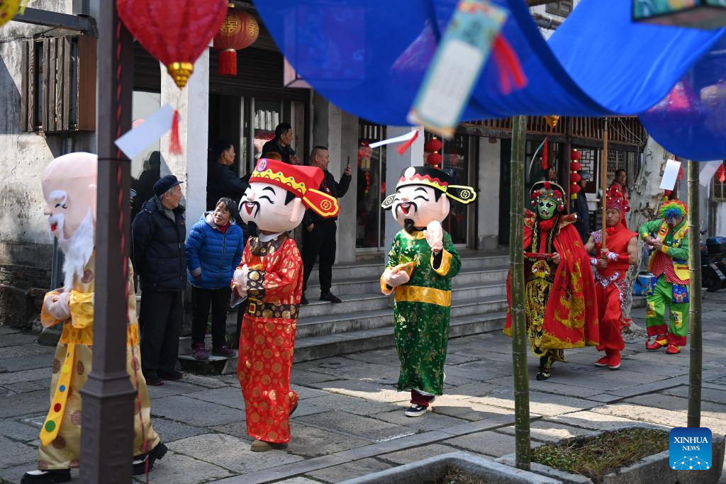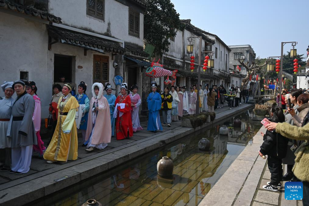 Folk culture performers wearing costumes are pictured during a parade at Shuanglin ancient town in Huzhou, east China's Zhejiang Province, March 9, 2024. A silk culture festival and temple fair parade was held here on Saturday and attracted many tourists. (Xinhua/Huang Zongzhi)