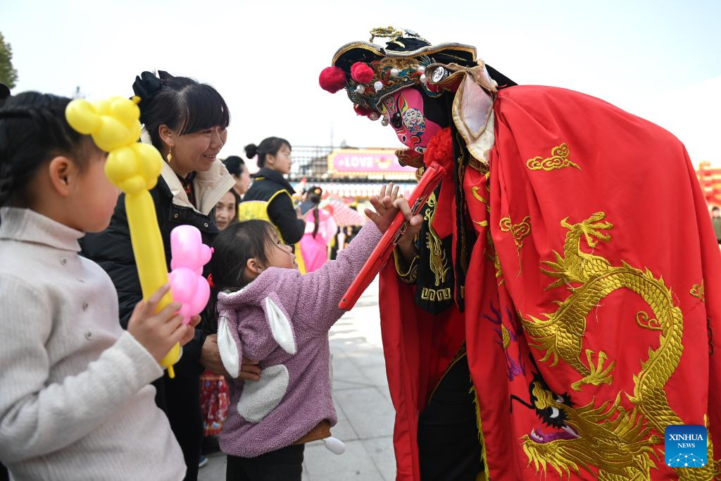 An actor interacts with the audience while performing face-changing stunt of Sichuan Opera at Shuanglin ancient town in Huzhou, east China's Zhejiang Province, March 9, 2024. A silk culture festival and temple fair parade was held here on Saturday and attracted many tourists. (Xinhua/Huang Zongzhi)