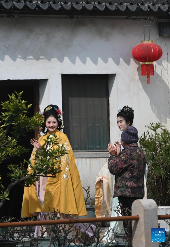 Girls wearing traditional Chinese costumes wave to a resident during a parade at Shuanglin ancient town in Huzhou, east China's Zhejiang Province, March 9, 2024. A silk culture festival and temple fair parade was held here on Saturday and attracted many tourists. (Xinhua/Huang Zongzhi)