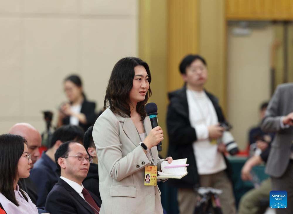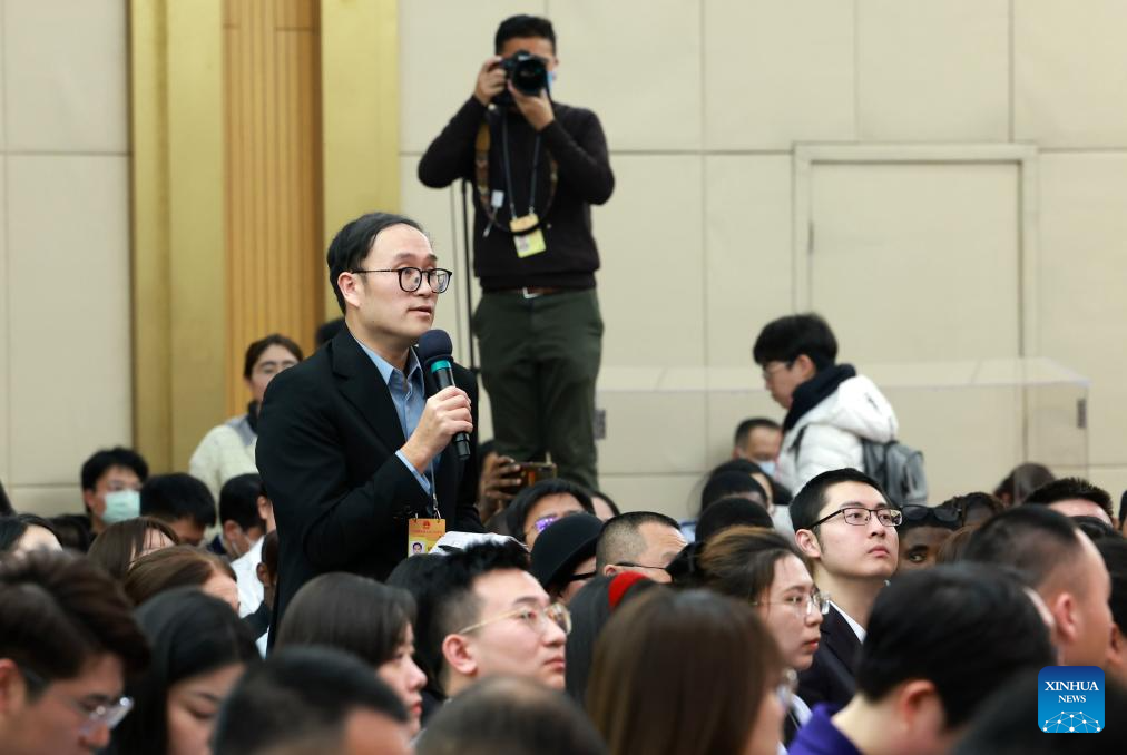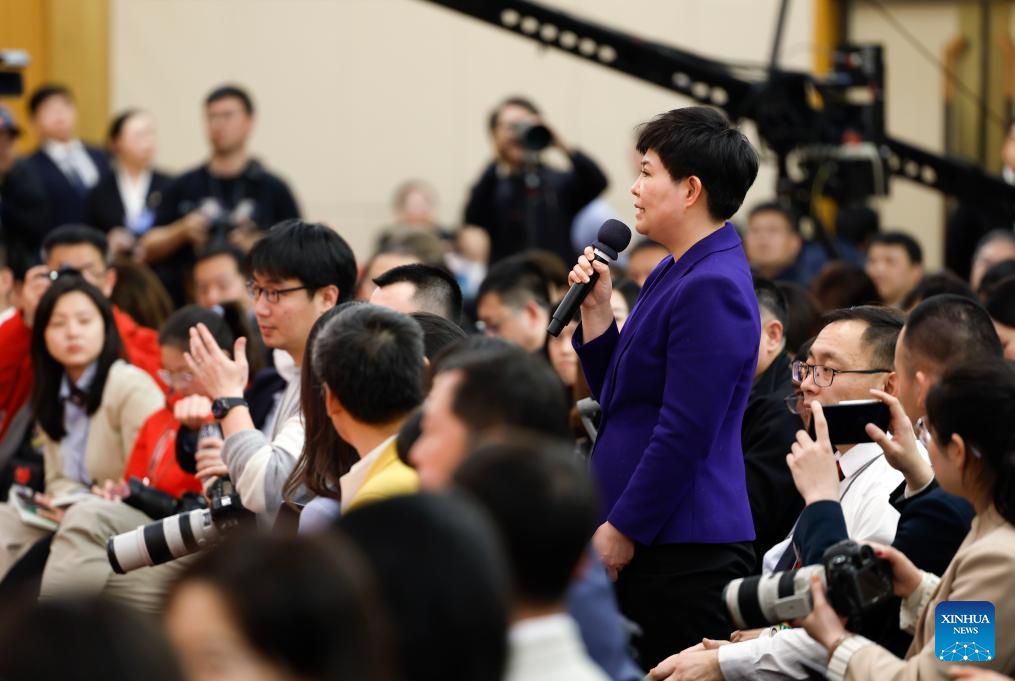 A journalist asks a question at a press conference on people's livelihood for the second session of the 14th National People's Congress (NPC) in Beijing, capital of China, March 9, 2024. China's Minister of Education Huai Jinpeng, Minister of Human Resources and Social Security Wang Xiaoping, Minister of Housing and Urban-Rural Development Ni Hong, and Chief of the National Disease Control and Prevention Administration Wang Hesheng attended the press conference on Saturday. (Xinhua/Wang Jingqiang)
