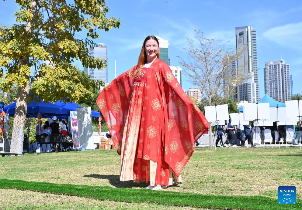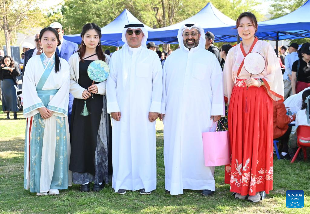 A woman wearing traditional Chinese attire poses for photos during the Chinese Culture and Food Festival at the Sheikh Jaber Al-Ahmad Cultural Centre in the Capital Governorate, Kuwait, on March 9, 2024. The Chinese Culture and Food Festival was held here on Saturday. (Photo by Asad/Xinhua)