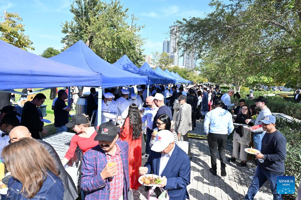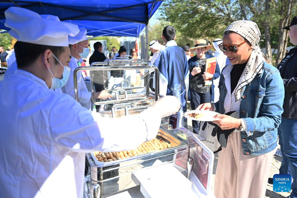 People taste Chinese food during the Chinese Culture and Food Festival at the Sheikh Jaber Al-Ahmad Cultural Centre in the Capital Governorate, Kuwait, on March 9, 2024. The Chinese Culture and Food Festival was held here on Saturday. (Photo by Asad/Xinhua)