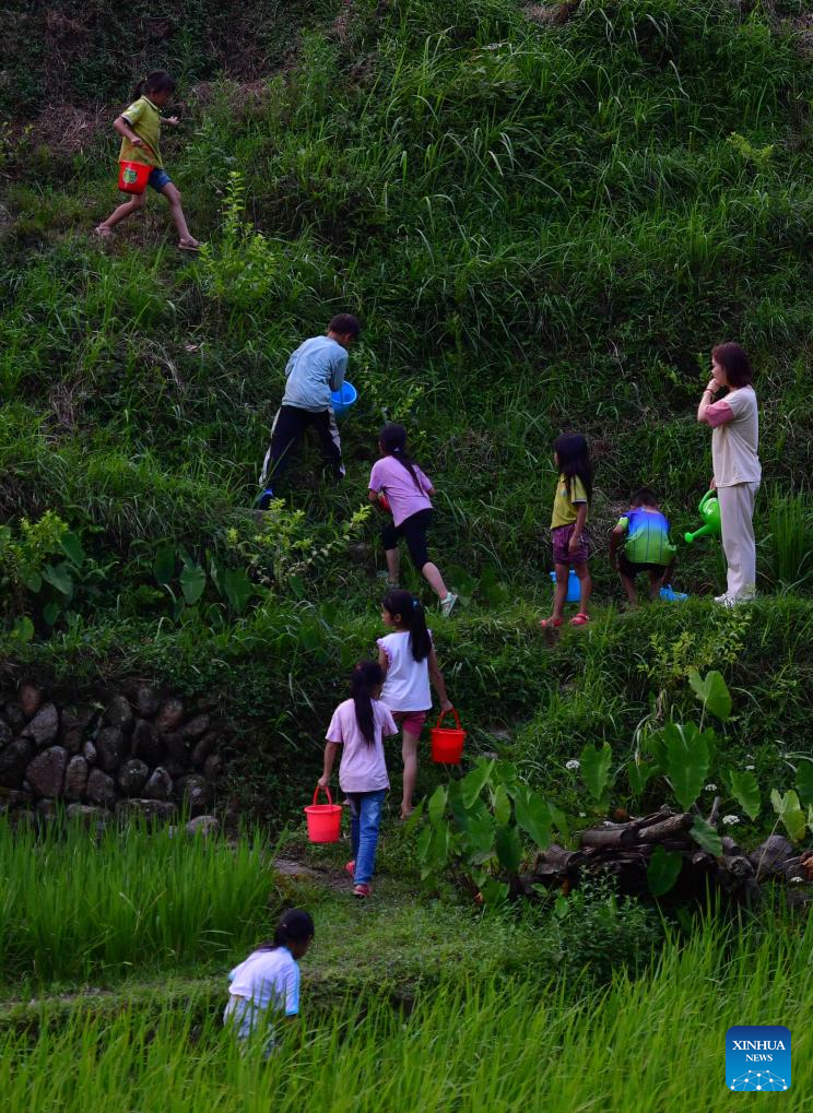 College student Pan Muzhi (1st R) and primary school students water the saplings in Wuying Village on the border between south China's Guangxi Zhuang Autonomous Region and southwest China's Guizhou Province, July 14, 2021. (Xinhua/Huang Xiaobang)