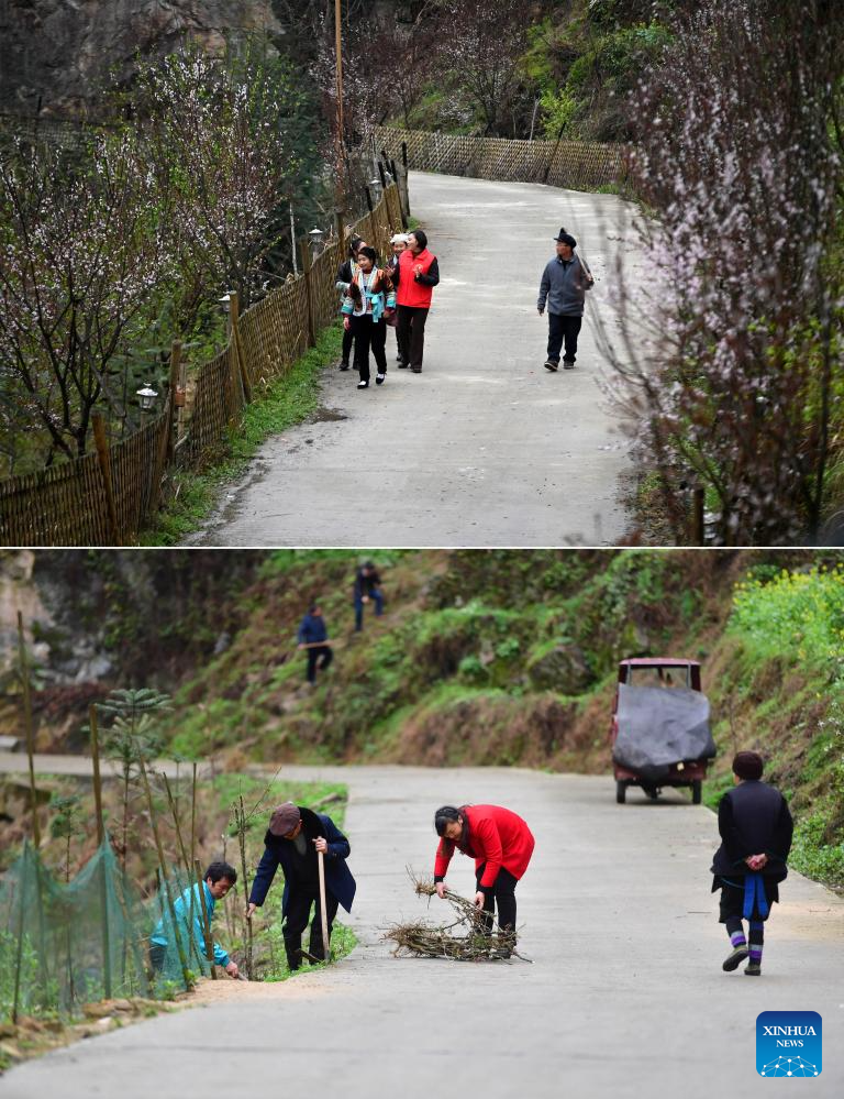 This combo photo shows blossoming fruit trees on March 9, 2024 (up) and villagers and volunteers planting trees along a road on March 3, 2020 in Wuying Village on the border between south China's Guangxi Zhuang Autonomous Region and southwest China's Guizhou Province. (Xinhua/Huang Xiaobang)