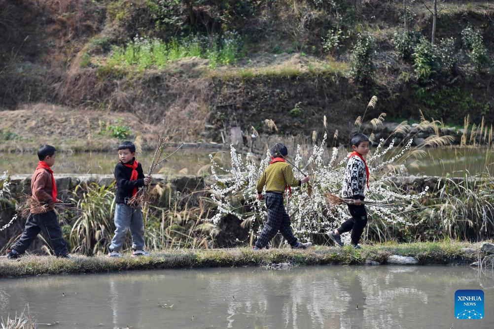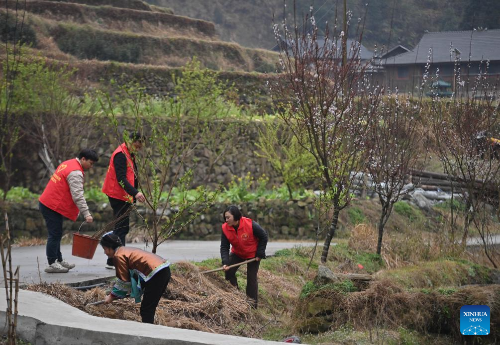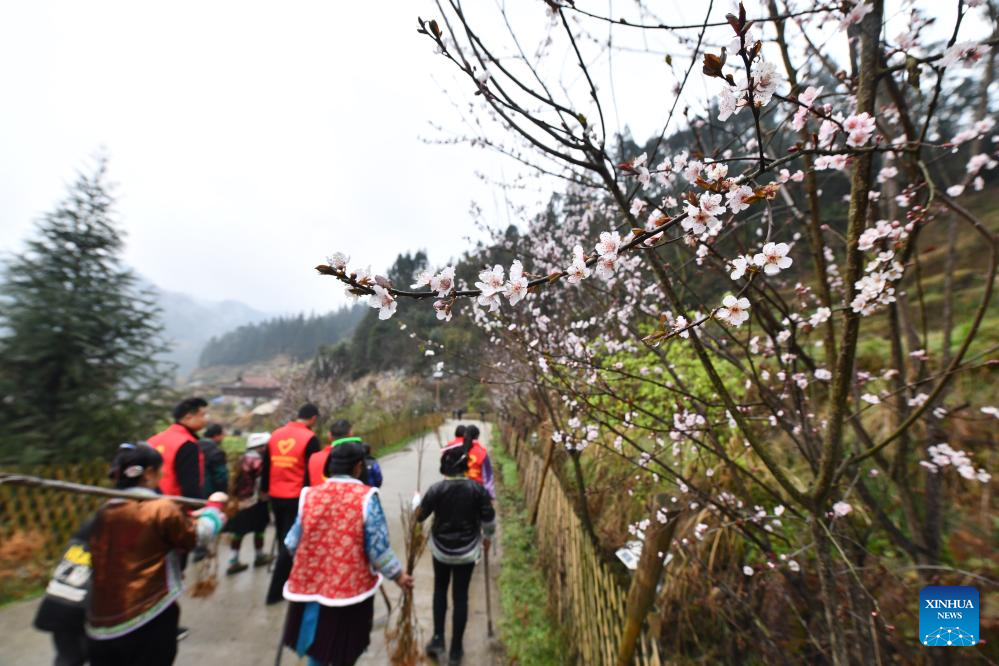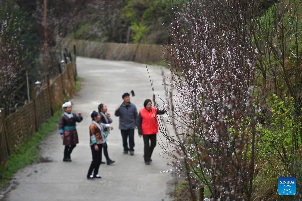Villagers and volunteers view flowers after planting trees in Wuying Village on the border between south China's Guangxi Zhuang Autonomous Region and southwest China's Guizhou Province, March 9, 2024. (Xinhua/Huang Xiaobang)