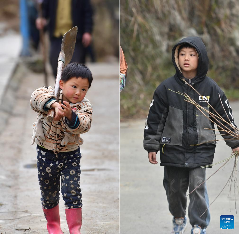 This combo photo shows 5-year-old Wu Liangyou carrying a shovel and following adults to plant trees on March 15, 2019 (L) and 10-year-old Wu Liangyou carrying saplings and following adults to plant trees on March 9, 2024 in Wuying Village on the border between south China's Guangxi Zhuang Autonomous Region and southwest China's Guizhou Province. (Xinhua/Huang Xiaobang)