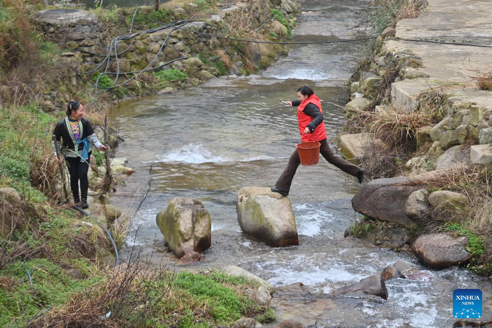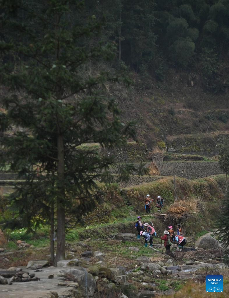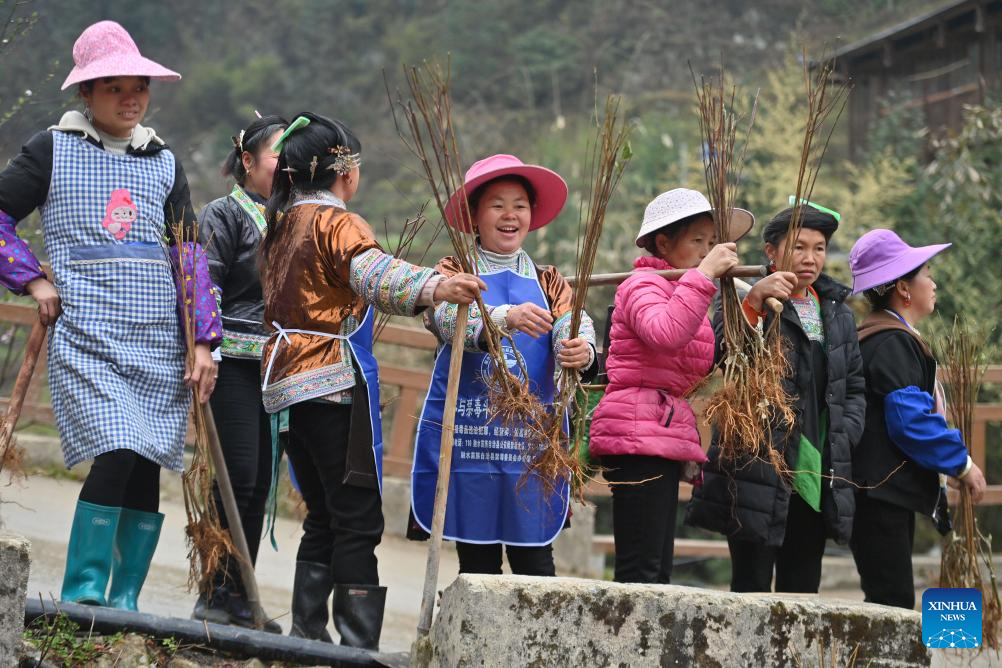 Female villagers collect saplings and prepare for planting in Wuying Village on the border between south China's Guangxi Zhuang Autonomous Region and southwest China's Guizhou Province, March 9, 2024. (Xinhua/Huang Xiaobang)
