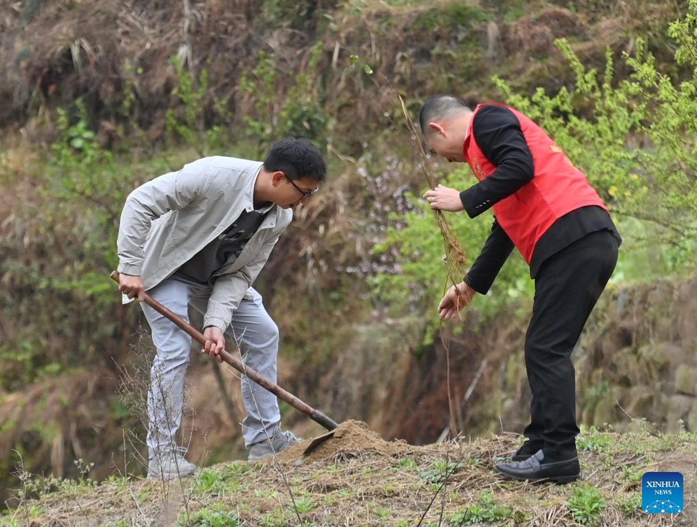 Villagers and volunteers plant trees in Wuying Village on the border between south China's Guangxi Zhuang Autonomous Region and southwest China's Guizhou Province, March 9, 2024. (Xinhua/Huang Xiaobang)