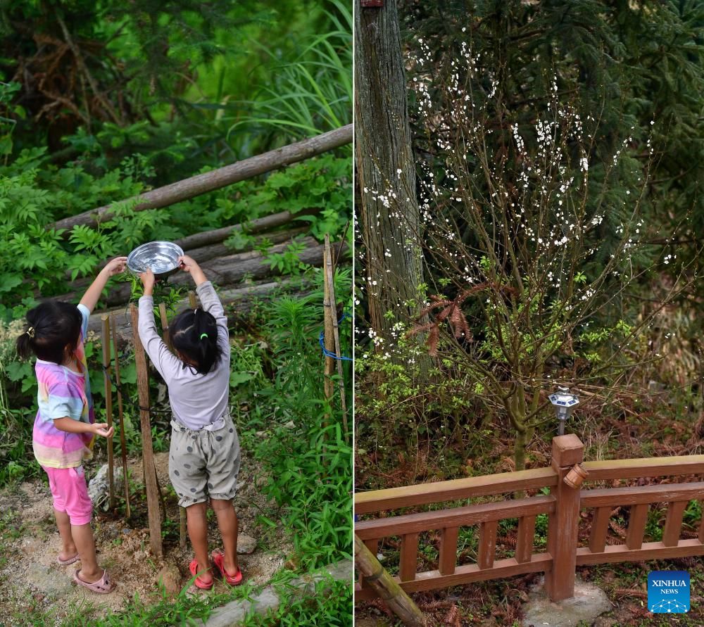 This combo photo shows children water saplings on June 20, 2020 (L) and the same tree blossoming on March 10, 2024 in Wuying Village on the border between south China's Guangxi Zhuang Autonomous Region and southwest China's Guizhou Province. (Xinhua/Huang Xiaobang)