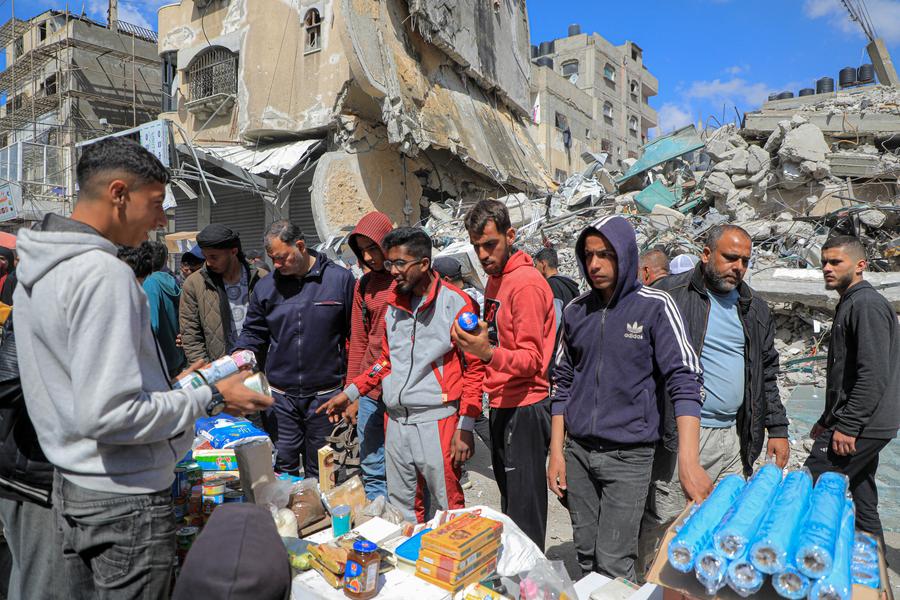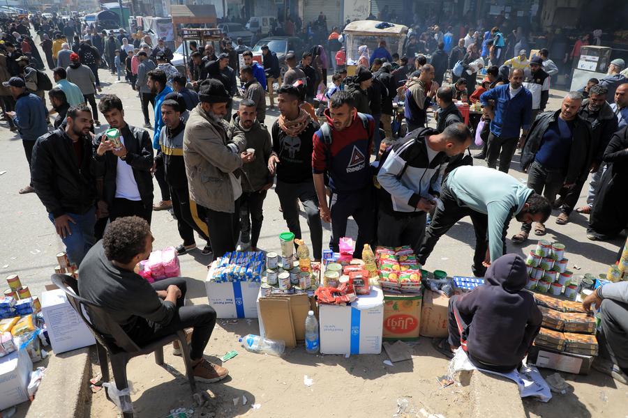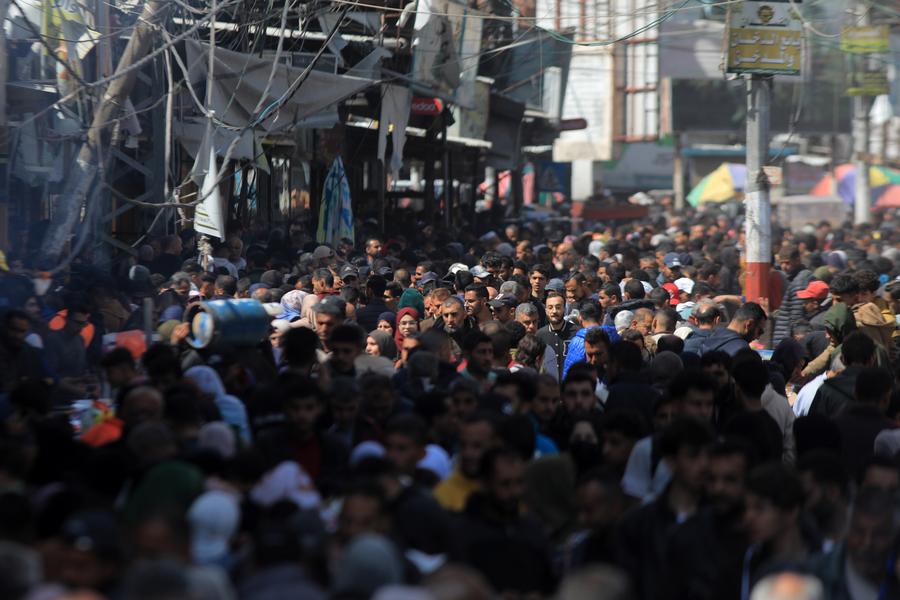 People shop at a market ahead of Ramadan in the southern Gaza Strip city of Rafah, on March 10, 2024. (Photo by Rizek Abdeljawad/Xinhua)