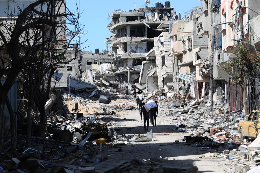 People walk on a street with destroyed buildings in the southern Gaza Strip city of Rafah, on March 8, 2024. (Photo by Khaled Omar/Xinhua)