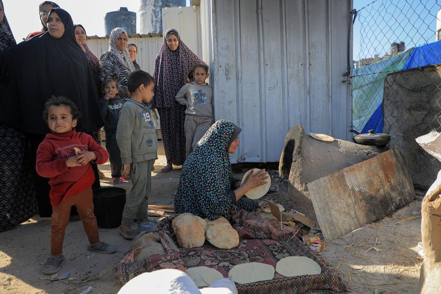A woman makes bread at a temporary camp in the southern Gaza Strip city of Rafah, on March 8, 2024. (Photo by Rizek Abdeljawad/Xinhua)