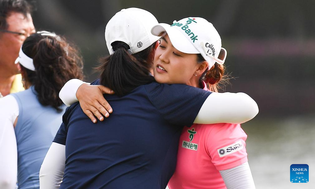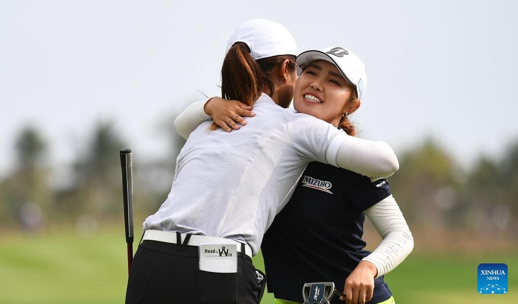 Minjee Lee (R) of Australia and Liu Ruixin of China hug after the final round of the Blue Bay LPGA golf tournament in Lingshui, south China's Hainan Province, March 10, 2024. (Xinhua/Yang Guanyu)