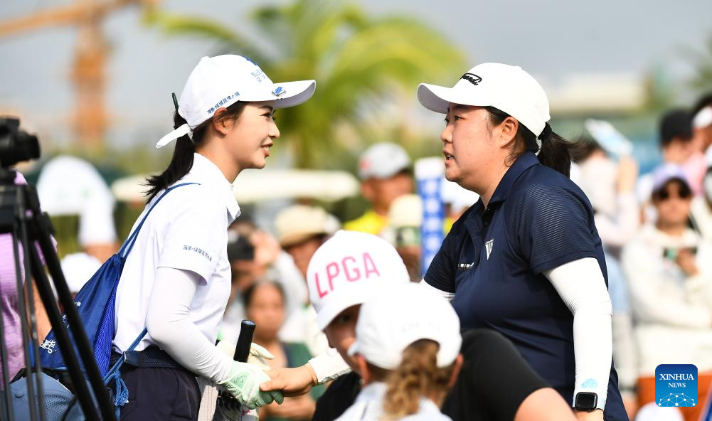 Liu Ruixin (R) of China shakes hands with a staff member after the final round of the Blue Bay LPGA golf tournament in Lingshui, south China's Hainan Province, March 10, 2024. (Xinhua/Yang Guanyu)