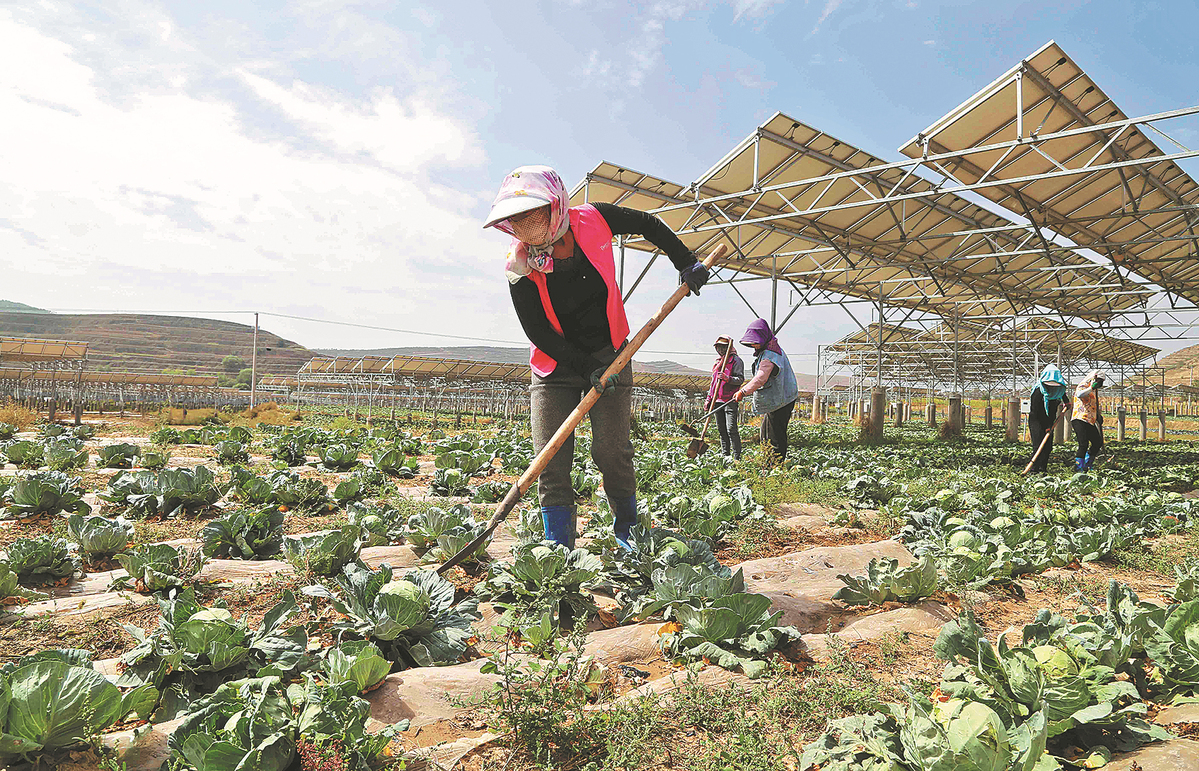 Farmers plant cabbages near PV panels in Tongwei, Gansu province, in September. [WANG KEXIAN/XINHUA]