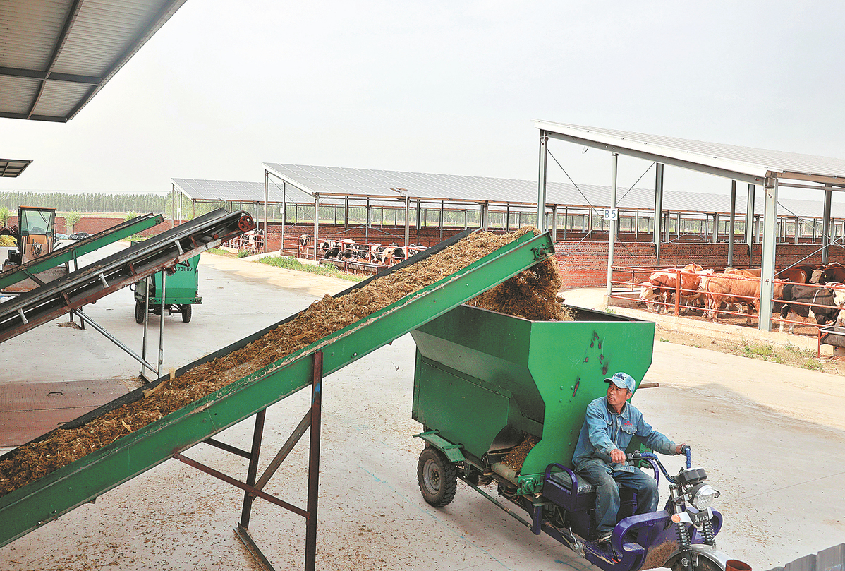 Workers prepare feed for cattle at a farm in Tangshan, Hebei province, in May. The farm installed PV panels on cattle shed roofs to raise farmers' incomes. [YANG SHIYAO/XINHUA]