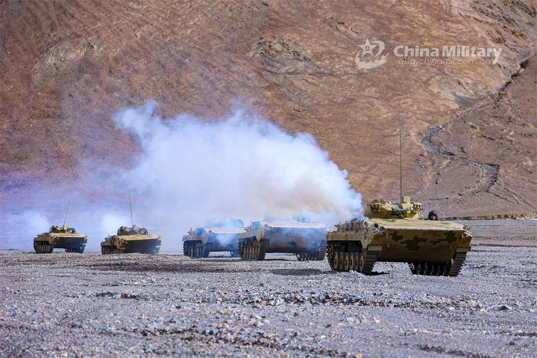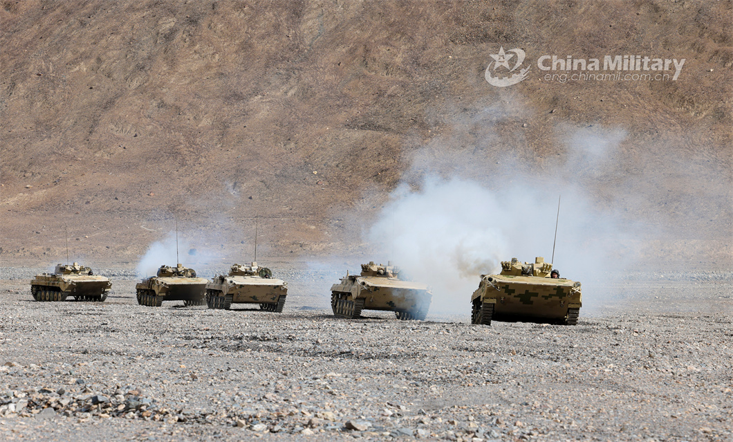 Armored vehicles attached to an armored detachment of a regiment under the PLA Xinjiang Military Command kick up plumes of dust en route to a designated area during a 3-day driving skill training exercise from February 10 to 12, 2024. (eng.chinamil.com.cn/Photo by Liu Tao)