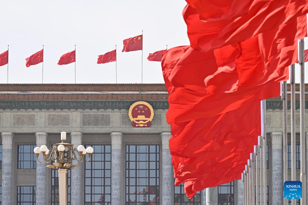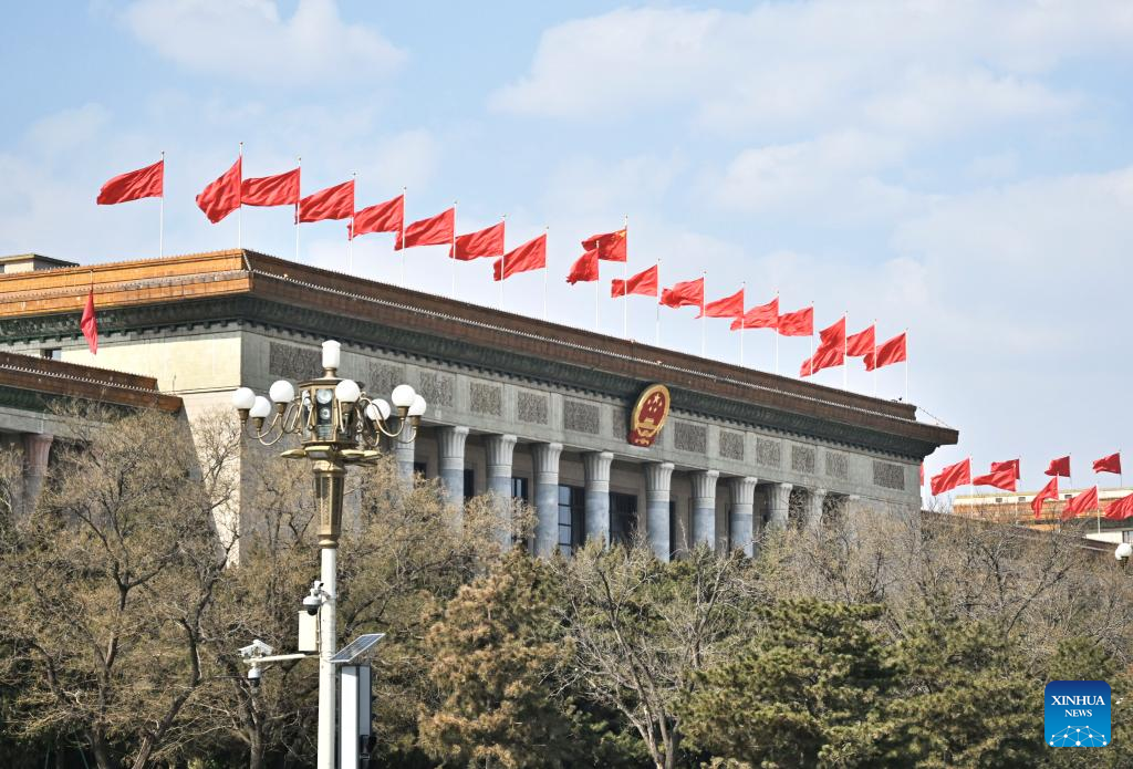This photo taken on March 11, 2024 shows the Great Hall of the People ahead of the closing meeting of the second session of the 14th National People's Congress (NPC) in Beijing, capital of China. (Xinhua/Li Xin)
