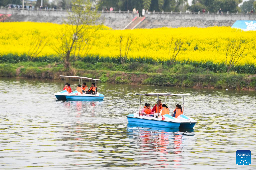 Tourists take boats to enjoy the view of rapeseed flowers at Chongkan scenic spot in Tongnan District, southwest China's Chongqing Municipality, March 9, 2024.?(Xinhua/Wang Quanchao)