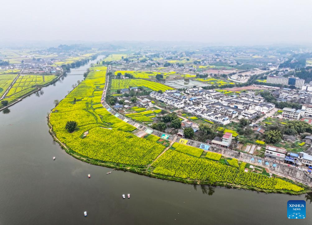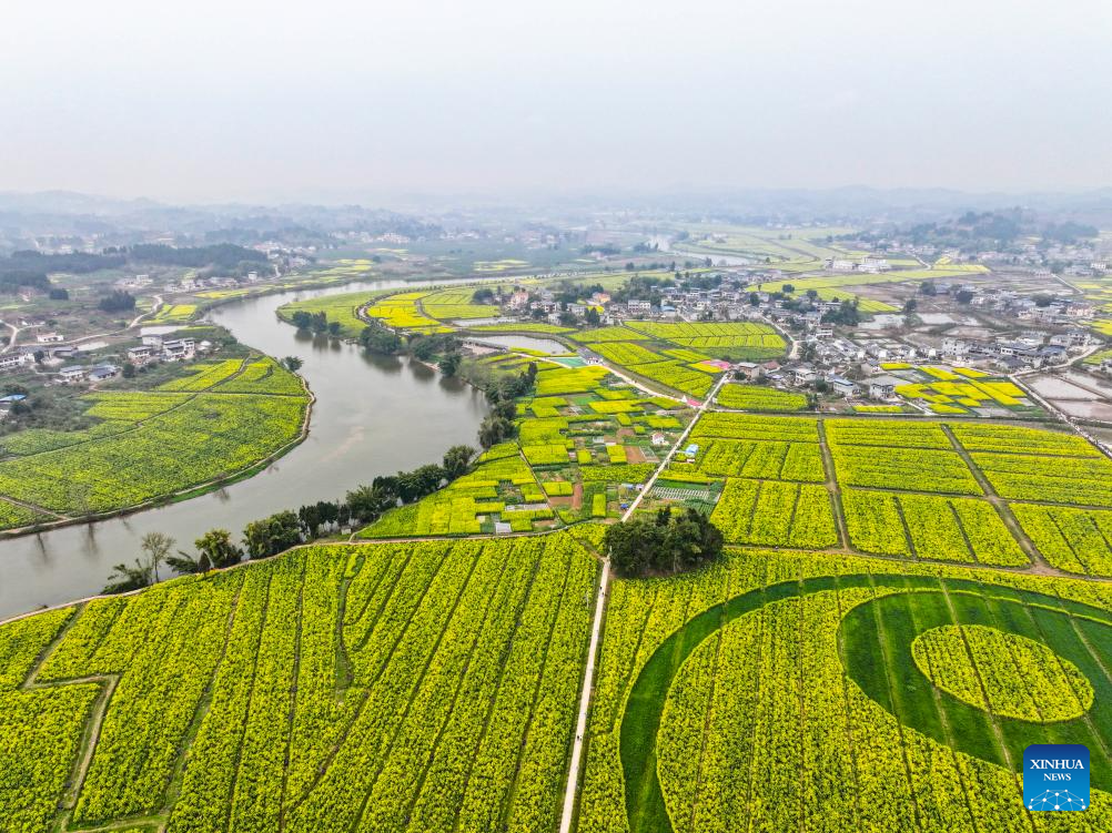 An aerial drone photo taken on March 9, 2024 shows a view of oilseed rape fields at Chongkan scenic spot in Tongnan District, southwest China's Chongqing Municipality.?(Xinhua/Wang Quanchao)
