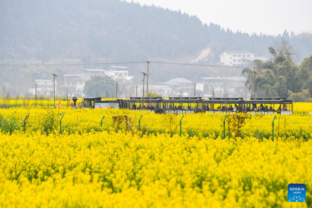 Tourists take a sightseeing mini train to enjoy the view of rapeseed flowers at Chongkan scenic spot in Tongnan District, southwest China's Chongqing Municipality, March 9, 2024.?(Xinhua/Wang Quanchao)