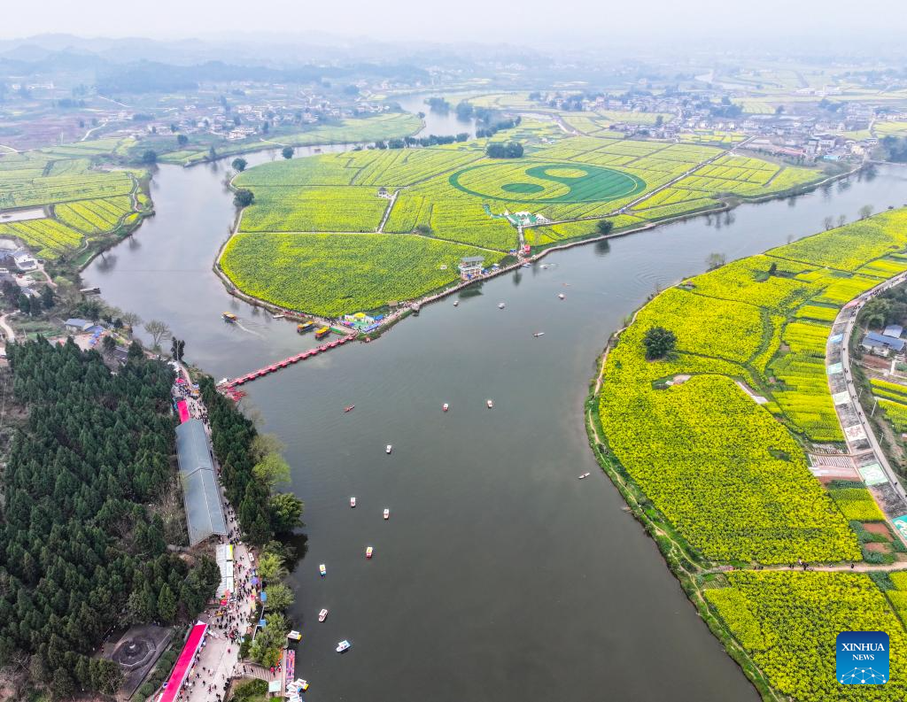 An aerial drone photo taken on March 9, 2024 shows tourists taking boats to enjoy the view of rapeseed flowers at Chongkan scenic spot in Tongnan District, southwest China's Chongqing Municipality.?(Xinhua/Wang Quanchao)
