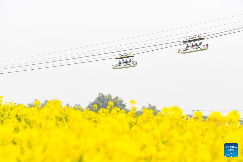 Tourists take cable cars to enjoy the view of rapeseed flowers at Chongkan scenic spot in Tongnan District, southwest China's Chongqing Municipality, March 9, 2024.?(Xinhua/Wang Quanchao)