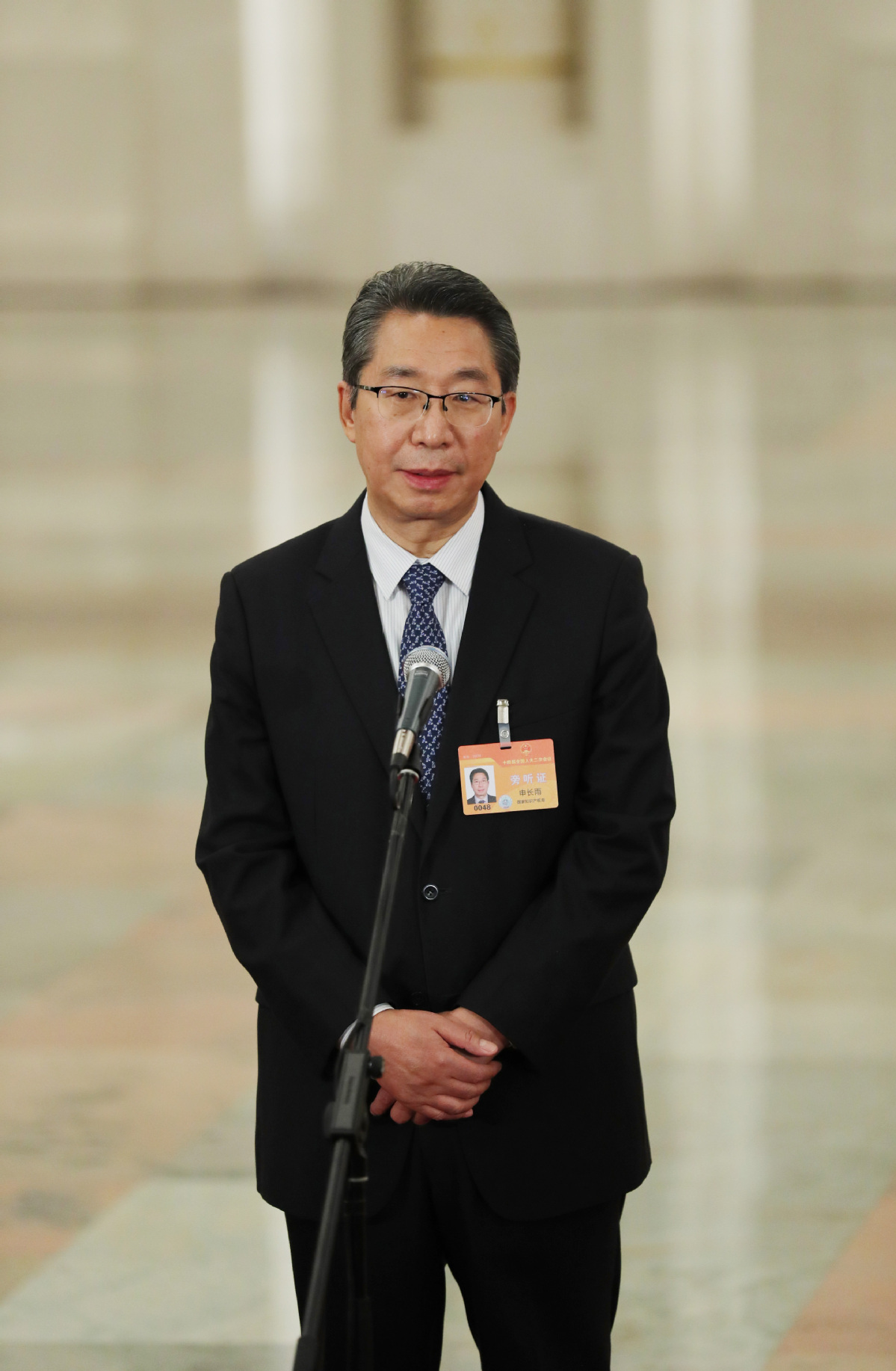 Shen Changyu, head of the National Intellectual Property Administration, speaks at a minister's passage interview on March 11, 2024. [Photo by Kuang Linhua/China Daily]