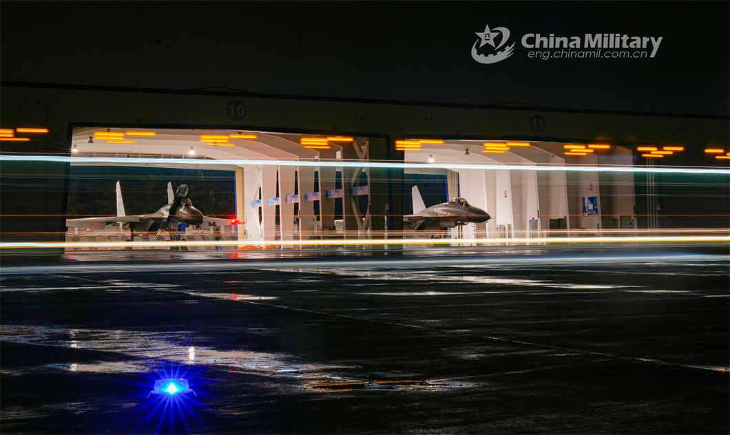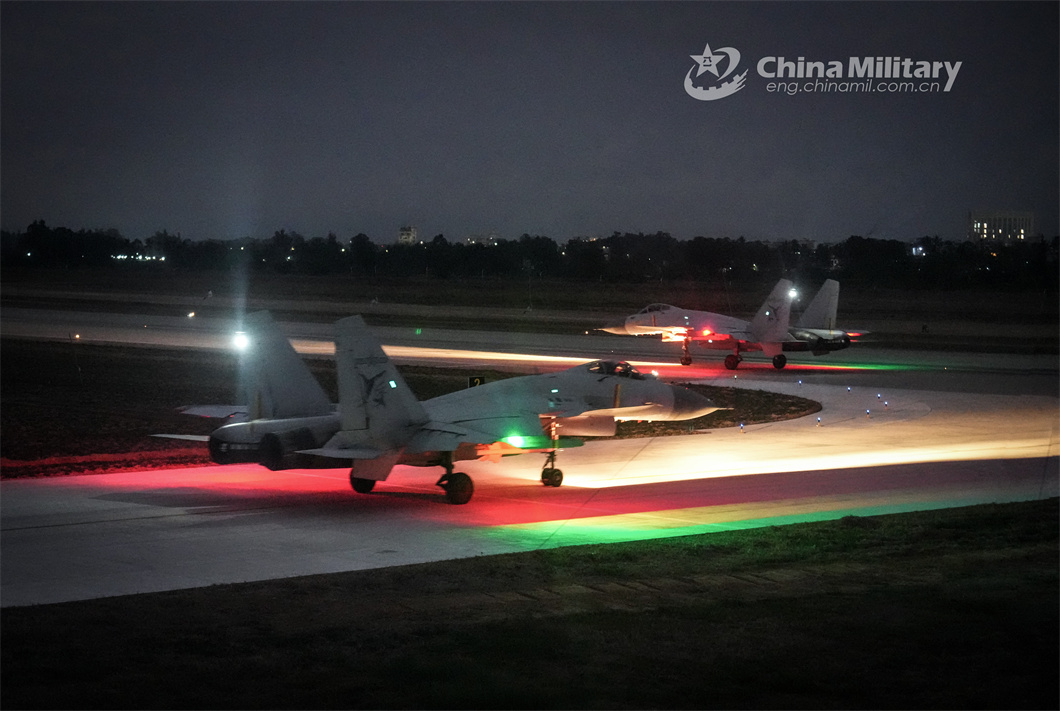 Fighter jets attached to a naval aviation unit taxi out of the parking apron during a round-the-clock flight training exercise recently. (eng.chinamil.com.cn/Photo by Li Yufei)