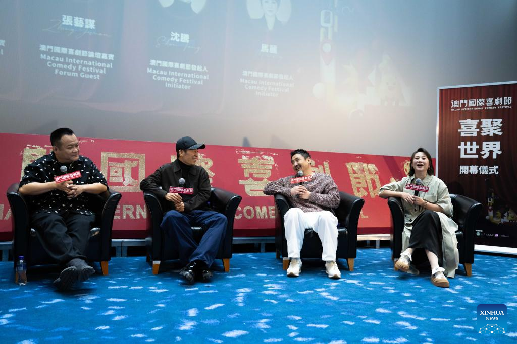 Directors Zhang Yimou (2nd, L), Ning Hao (1st, L), and film artists Shen Teng (2nd, R), Ma Li attend a dialogue during the Macao International Comedy Festival in south China's Macao, March 11, 2024. The first Macao International Comedy Festival began here on Monday with various comedy films and theater plays from multiple cultures ready for the audience. (Xinhua/Cheong Kam Ka)