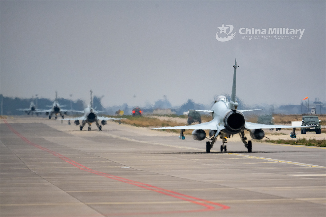 A group of J-10 fighter jets attached to an aviation brigade with the air force under the PLA Southern Theater Command taxi in close formation on the runway prior to a flight training exercise on February 24, 2024. (eng.chinamil.com.cn/Photo by Shang Yanjie)