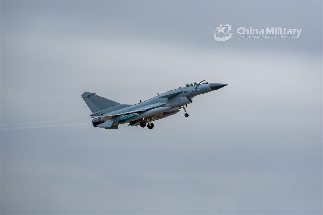 A J-10 fighter jet attached to an aviation brigade with the air force under the PLA Southern Theater Command soars into the air during a flight training exercise under complex conditions on February 24, 2024. (eng.chinamil.com.cn/Photo by Shang Yanjie)