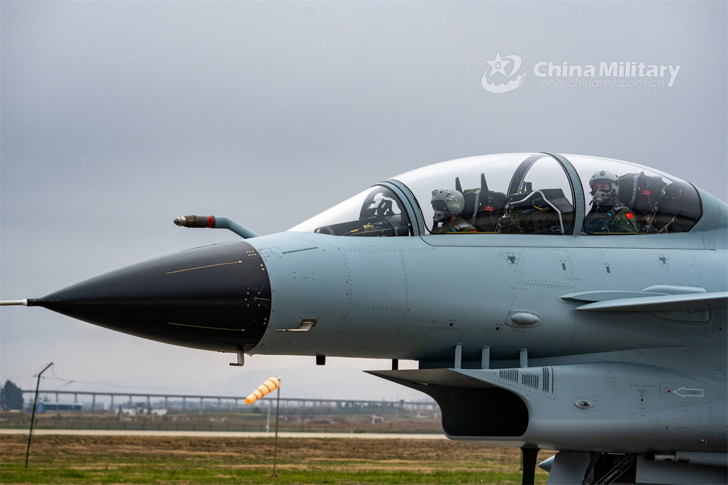 Pilots assigned to an aviation brigade with the air force under the PLA Southern Theater Command get well-prepared in the cockpit of their J-10 fighter jet before takeoff during a flight training exercise under complex conditions on February 24, 2024. (eng.chinamil.com.cn/Photo by Shang Yanjie)