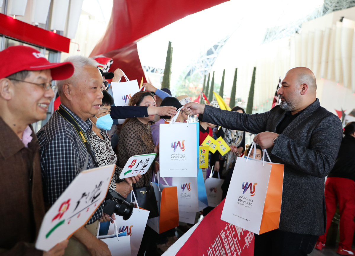 A staff member (right) hands out souvenirs to Chinese tourists at a Ferrari-branded theme park in Abu Dhabi in February. [Photo/Xinhua]