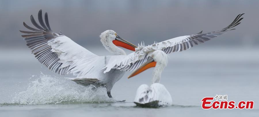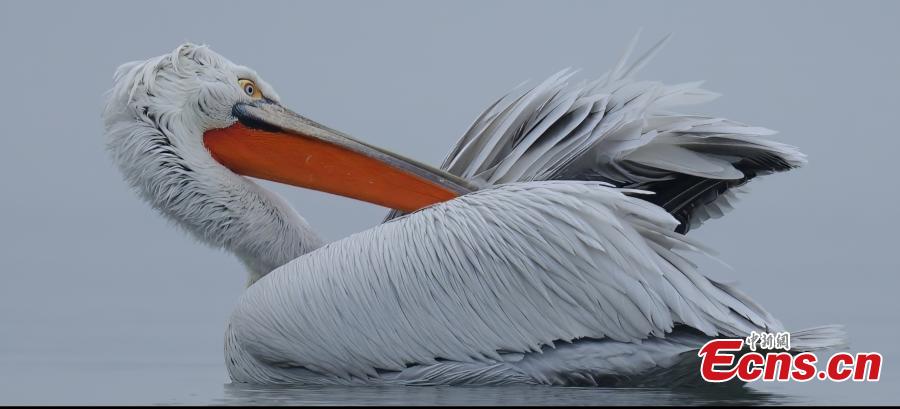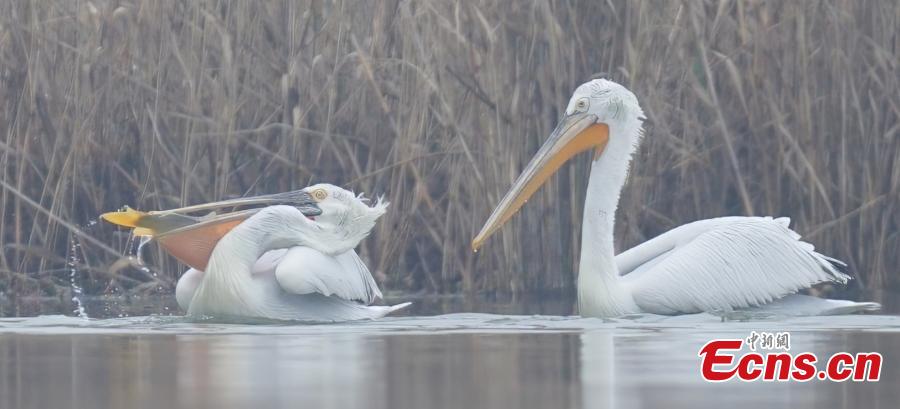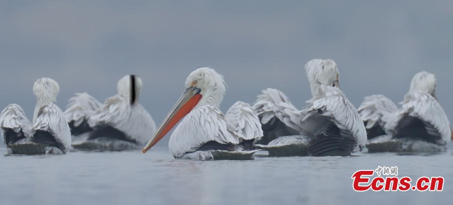 Dalmatian pelicans (Pelecanus crispus) rest at Xuanmen Bay national wetland park in the city of Yuhuan, east China's Zhejiang Province. (Photo: China News Service/Chen Yanxue)